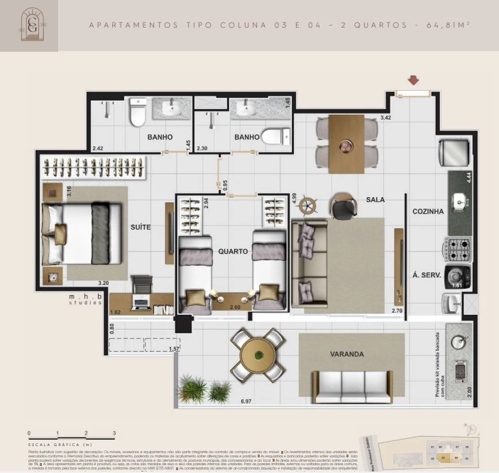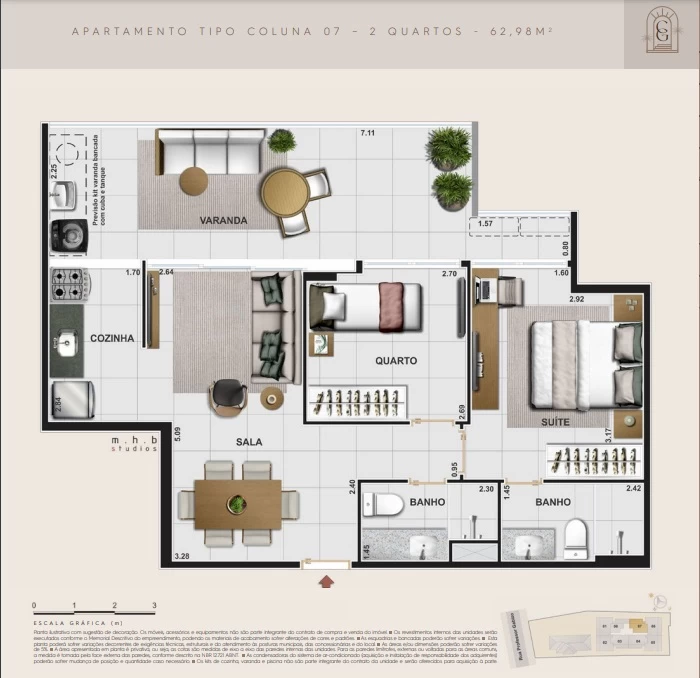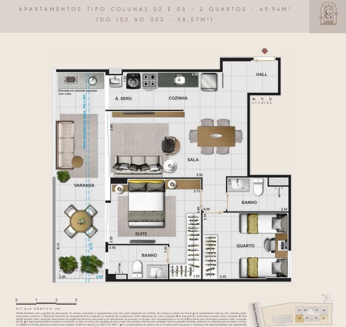 quartos com 58m² até 69m².